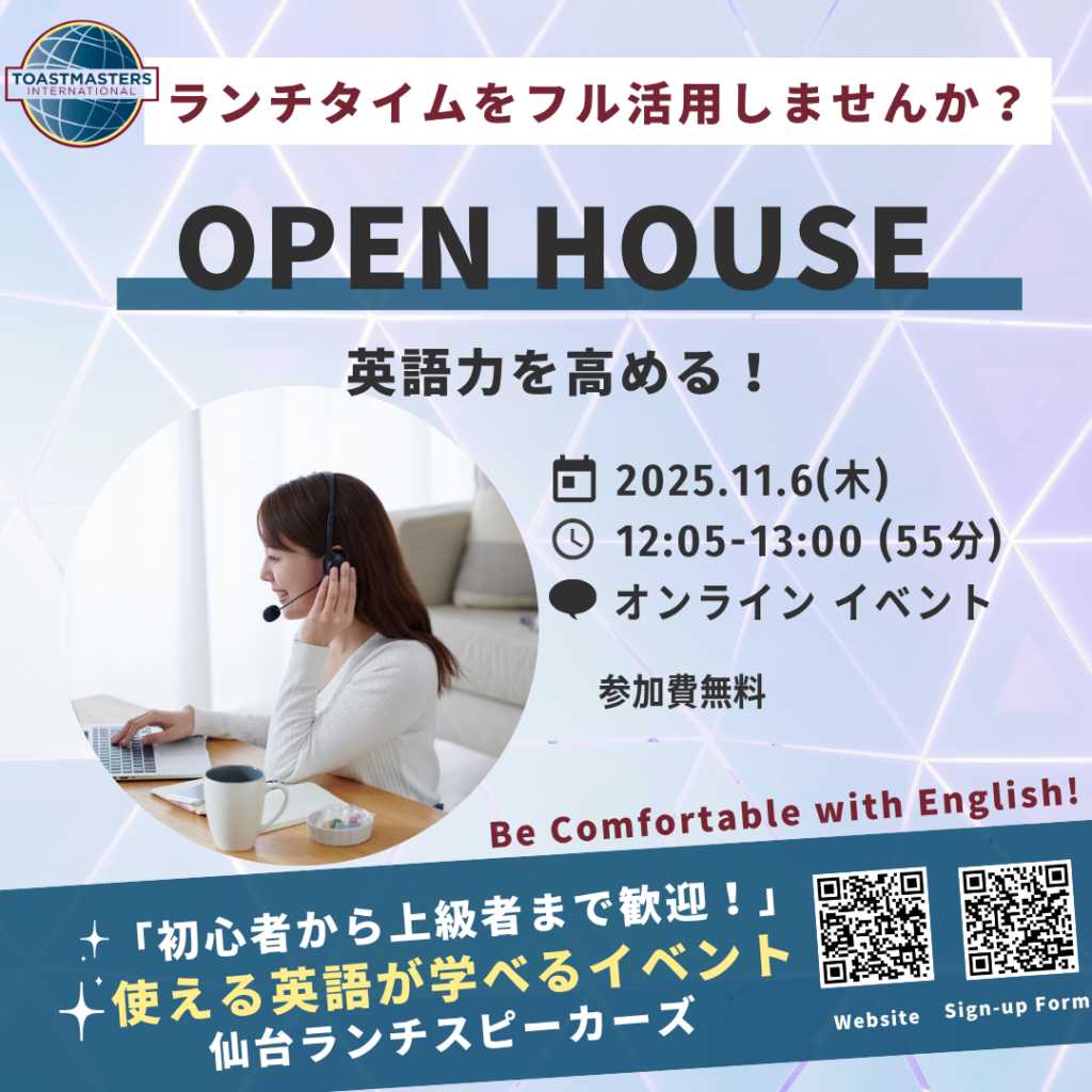 During the Open House, guests can experience Table Topics, an impromptu speaking session, where you can try out mini-speeches in English or Japanese. Don’t worry if you think Toastmasters is a place with a high-barrier —it’s a friendly place where mistakes are part of the learning journey. Whether you want to make the most of your lunch break, join an English study group, or develop confident presentation techniques, we’d love for you to join us.